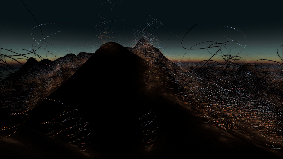 Locked in perpetual twilight – prime mosquito blood-feeding time – AfterGlow presents a terrain progressively illuminated by glowing trails, evocative of mosquito flight paths. These spiralling forms represent packets of blood, carried by mosquitoes infected with Plasmodium knowlesi, a malaria parasite recently found to jump the species barrier from monkey to human. The infection left in the wake of wandering macaques as they search the island for food reveals the intimate relationship between disease and its environment. In AfterGlow the spectator is taken on a real-time journey through the eyes of an autonomous camera which traverses the island following the infection scenario; from clustering luminous spiralling cells of colour to black turbulent infectious spirals. Where the infection is most dense, we see a blizzard of disease, vividly expressing the complexity of this dangerous scenario.